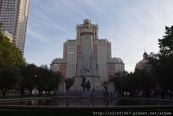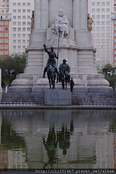 廣場上有立了一個紀念碑,是紀念西班牙最偉大的大文豪--塞萬提斯逝世300週年,他與他作品中最聞名的唐吉訶德與桑喬,不分晨昏晝夜,在這裡迎接全世界的遊客!